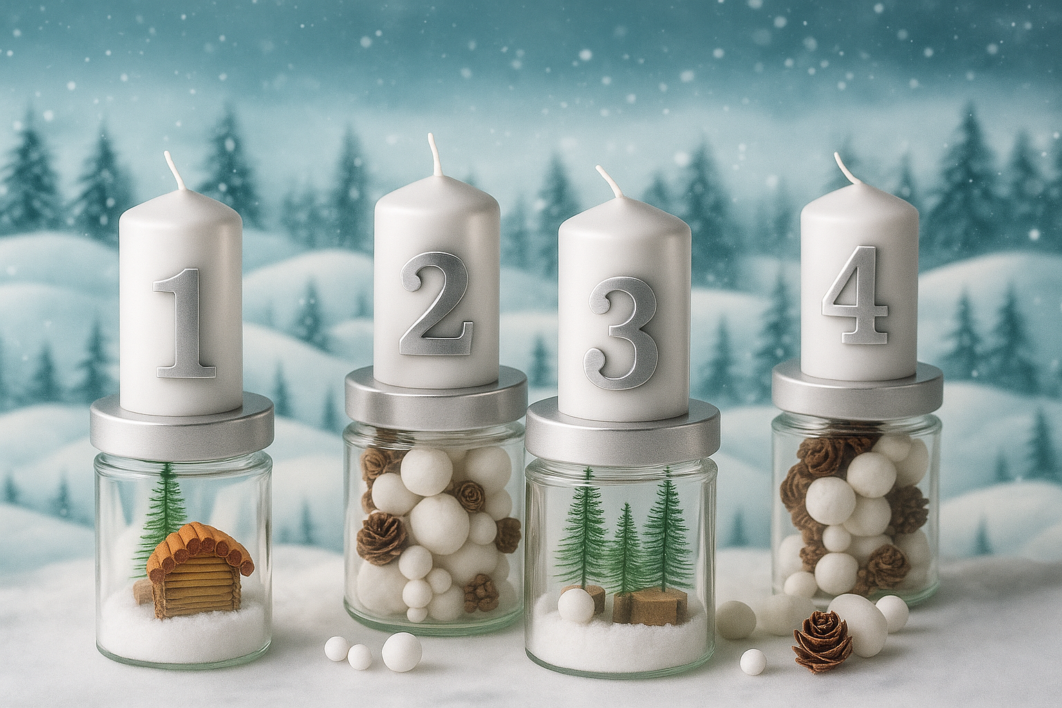 Aus schlichten, leeren Gläsern lässt sich im Handumdrehen ein moderner Adventskranz gestalten. Mit Kerzen und weihnachtlicher Deko befüllt und als stimmungsvolles Viererset arrangiert, entsteht eine kreative, nachhaltige und sichere Alternative zum klassischen Adventskranz. Mit nur wenigen Materialien und etwas Dekoration zauberst du so einen persönlichen Adventskranz „im Glas“ – perfekt, um die Adventszeit auf ganz besondere Weise zu gestalten.